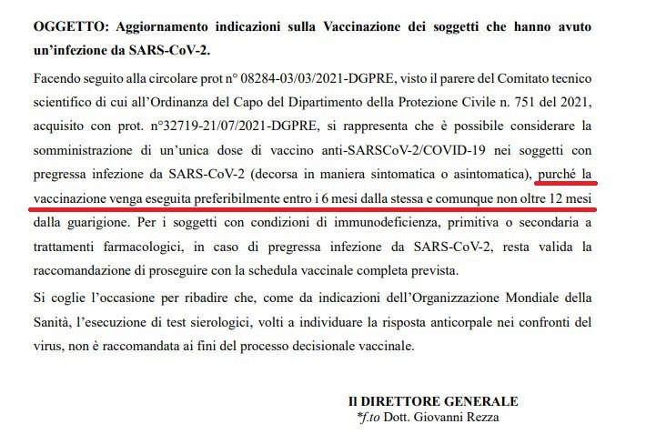 L’insussistenza dei presupposti per l’obbligo vaccinale sono appunto la condizione di guarigione che, come previsto dalla circolare 32884 del 21 Luglio prevedono “la vaccinazione preferibilmente entro i 6 mesi dalla stessa e comunque non oltre i 12 mesi”. Per analogia infatti anche il greenpass viene rilasciato per 6 mesi dalla guarigione, equiparando di fatto i vaccinati ai guariti da meno di 6 mesi.