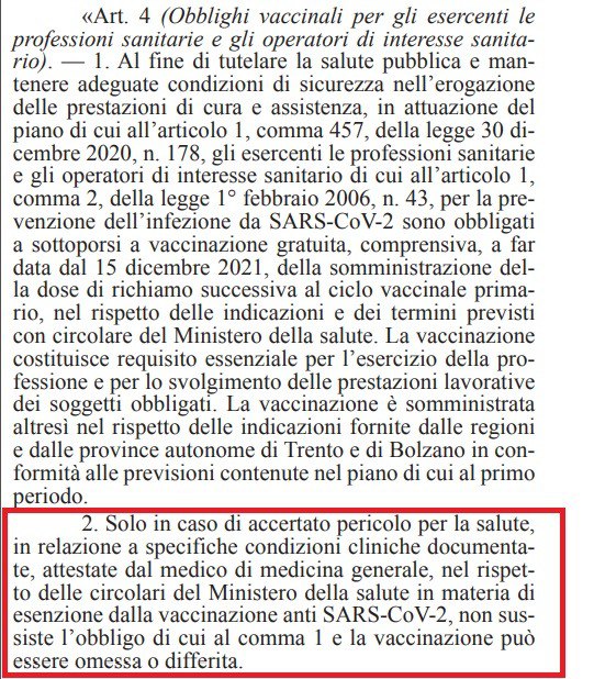 Per i lavoratori soggetti all’obbligo vaccinale (scuola, difesa, polizia, ecc.) al comma 2 viene specificato che si applicano “le disposizioni di cui all’articolo 4 comma 2 e 7”. L’articolo 4 è quello introdotto sempre nello stesso decreto ovvero l’obbligo vaccinale per il ciclo primario più la dose di richiamo per i lavoratori sanitari. Al comma 2 troviamo che “solo in caso di accertato pericolo per la salute, in relazione a specifiche condizioni cliniche documentate, attestate dal medico di medicina generale, nel rispetto delle circolari del Ministero della salute in materia di esenzione dalla vaccinazione anti SARS-CoV-2, non sussiste l’obbligo di cui al comma 1 e la vaccinazione può essere omessa o differita”