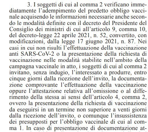 – “Nei casi in cui non risulti l’effettuazione della vaccinazione anti SARS-CoV-2 o la presentazione della richiesta di vaccinazione nelle modalità stabilite nell’ambito della campagna vaccinale in atto, i soggetti di cui al comma 2 invitano, senza indugio, l’interessato a produrre, entro cinque giorni dalla ricezione dell’invito, la documentazione comprovante l’effettuazione della vaccinazione oppure l’attestazione relativa all’omissione o al differimento della stessa ai sensi dell’articolo 4, comma 2, ovvero la presentazione della richiesta di vaccinazione da eseguirsi in un termine non superiore a venti giorni dalla ricezione dell’invito, o comunque l’insussistenza dei presupposti per l’obbligo vaccinale di cui al comma 1.”