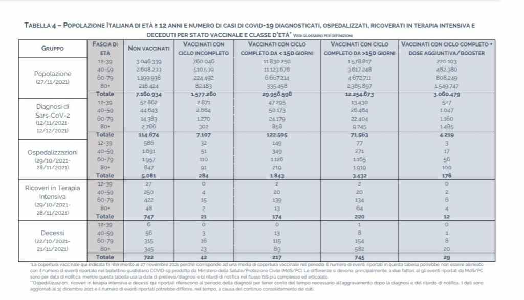Ultimo bollettino ISS del 15.12.2021Escluse le Terapie Intensive che, come si sa, procedono in ritardo (come trend) di 15-20 giorni, i numeri sono impietosi per chi ha fatto del vaccino il proprio totem.I contagiati vaccinati sono il doppio dei non vaccinati.I morti vaccinati superano di gran lunga i non vaccinati e stessa proporzione, ancor più marcata, riguarda i ricoverati, a svantaggio record per i vaccinati.Di questo passo tra Natale e Capodanno gli ospedali e il bollettino contagi vedranno i numeri riguardare quasi del tutto solo i vaccinati.Lo capirete quando si attaccheranno al dato differito delle sole Terapie Intensive che ancora è in linea con la loro narrazione, ma non sta più in piedi.Per lo meno per i contagi dove è più che evidente chi è che diffonde il contagio… a norma di Certificato di Obbedienza alias Super Green Pass.