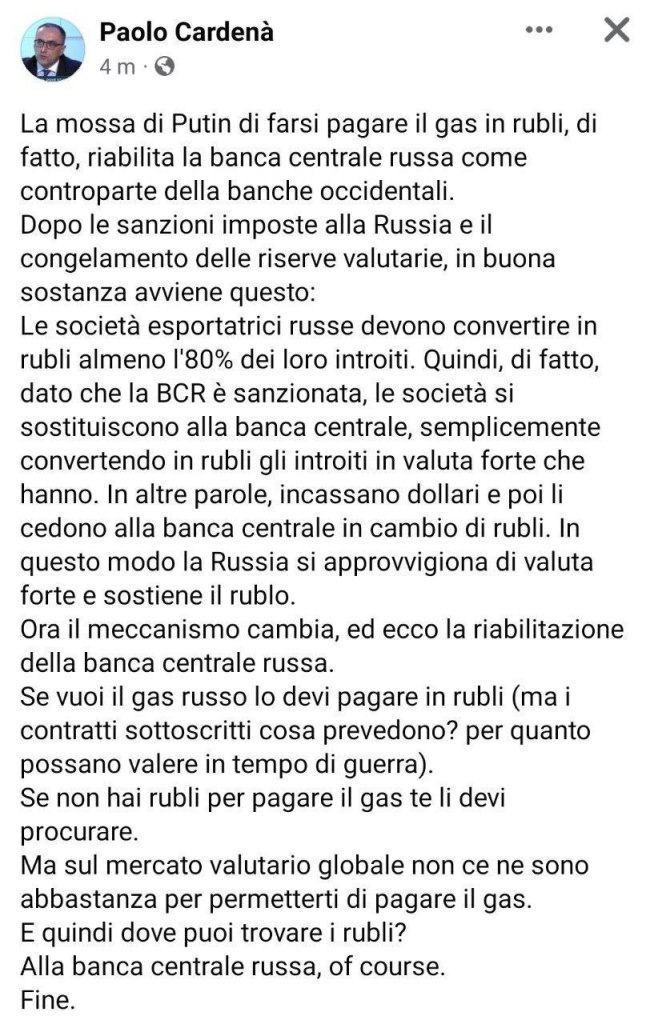 Putin ha deciso che i pagamenti per l’acquisto del gas russo dovranno essere eseguiti soltanto in rubli. Se a questa decisione aggiungiamo il recente accordo tra India e Russia per utilizzare le rupie indiane negli scambi commerciali tra i due Paesi, vediamo che si è messo in moto un meccanismo. L’UE attraverso la suicida politica di sanzioni alla Russia ha praticamente avviato la demolizione del pilastro della finanza internazionale dei Rothschild. Quel pilastro è il dollaro. Nel mondo unipolare tutte le decisioni e tutte le transazioni erano effettuate in dollari. Nel mondo multipolare, il baricentro delle decisioni si è spostato dalla sfera angloamericana verso quella degli altri blocchi geopolitici che si trovano al di fuori dell’Occidente liberale. L’era del Nuovo Ordine Mondiale è giunta al tramonto. È iniziata l’era del multipolarismo ed è stato Vladimir Putin a portarci in essa.