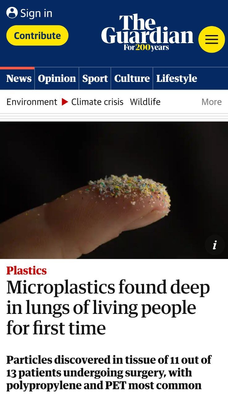 Un articolo apparso su The Guardian il 6/04/2022 ha messo in evidenza la presenza di microplastiche nel tessuto polmonare profondo prelevato da pazienti durante operazioni chirurgiche e da cadaveri durante autopsie. I materiali più comuni erano il polipropilene e il polietilene, utilizzati negli imballaggi in plastica e nei tubi. Lo stesso materiale (polietilene) era stato rinvenuto nel sangue umano.