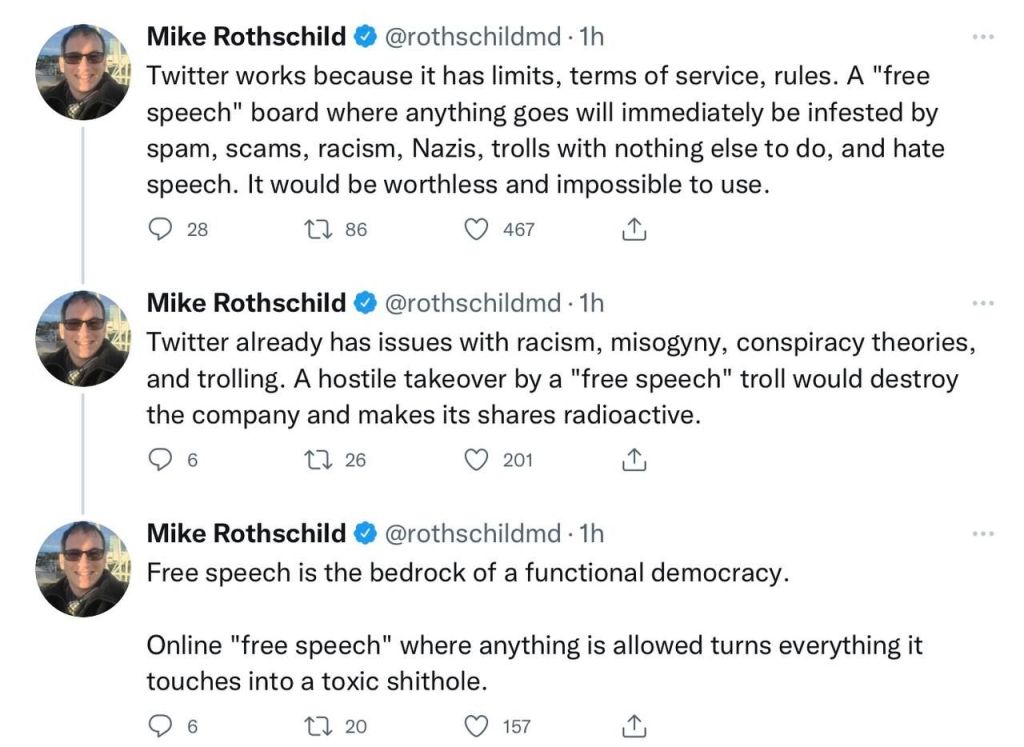Mike Rothschild, appartenente alla famigerata famiglia di banchieri, è estremamente preoccupato dall’OPA ostile lanciata da Musk per acquisire Twitter e la definisce una potenziale minaccia in grado di far proliferare “l’incitamento all’odio”, che nel gergo capovolto dell’ideologia globalista significa “libertà di pensiero”. Questa potrebbe essere la conferma definitiva che la mossa di Musk è pensata espressamente per strappare Twitter dalle mani del Deep State internazionale.