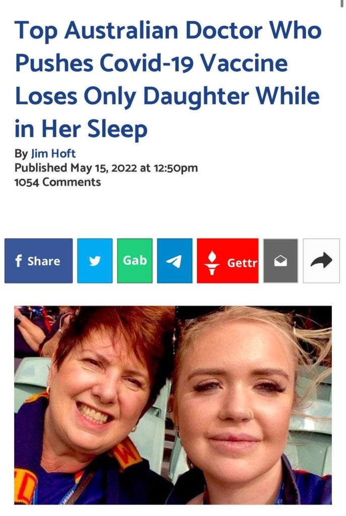 “La dottoressa australiana, presidente dell’Australian Medical Association South Australia, Michelle Atchison, è stata distrutta dalla morte inaspettata della sua unica figlia”.Clicca sorro per leggere l’articolo. https://www.thegatewaypundit.com/2022/05/top-australian-doctor-pushes-covid-19-vaccine-loses-daughter-sleep/