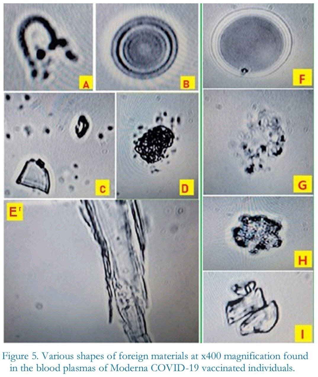 📊 “I campioni di sangue sono stati preparati e osservati allo stereomicroscopio dopo essere stati centrifugati a 2.200 rpm per 30 minuti. Dagli 8 vaccinati COVID-19: 6 campioni di plasma contenevano un disco multistrato di composizione non identificata; 3 campioni contenevano materiali simili a bobine di perline; 1 campione di plasma conteneva un fascio fibroso di materiale estraneo simile a perline; e un diverso gruppo di 3 campioni aveva formazioni cristalline di materiale estraneo. Le varie forme e dimensioni dei materiali estranei nel plasma centrifugato degli individui vaccinati contro il COVID-19 somigliavano da vicino alle forme e alle dimensioni dei materiali estranei precedentemente osservati direttamente nei vaccini stessi.”