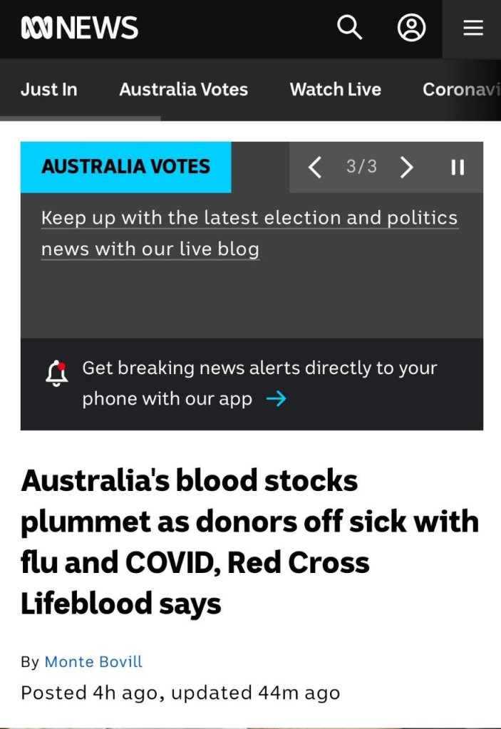 Si prevede che le scorte di sangue australiane scendano al punto più basso dall’inizio della pandemia dopo che le donazioni sono crollate a causa dell’attuale aumento dei casi di influenza in tutto il paese, nonché di raffreddori e COVID-19.