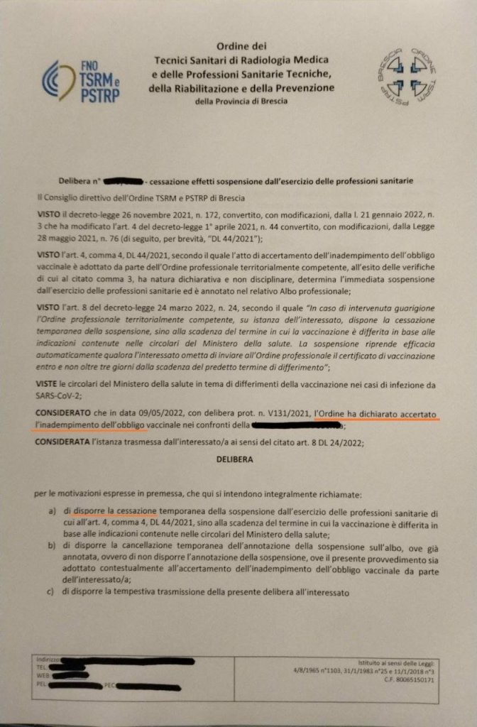 MA la legge ci dice che la sospensione non ha natura disciplinare, dunque l’ordine NON POTEVA SOSPENDERE se non dopo aver ricevuto un “atto di accertamento” emesso dalle autorità competenti.