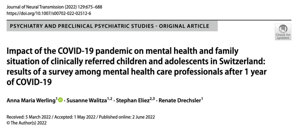 Impatto della pandemia di COVID-19 sul benessere mentale di bambini e adolescenti e sulle loro famiglie dal punto di vista di psichiatri e psicologi in Svizzera durante il primo anno della pandemia.