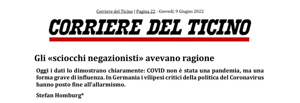 tedesco, gli argini sono crollati anche in questo paese. A questo si è aggiunta la guerra in Ucraina, perché le cifre del Coronavirus sono scomparse dai titoli dei giornali proprio il giorno dell’attacco di Putin. Come ha scritto giustamente Kurt W. Zimmermann in questo foglio: «Nei media, arriva sempre una sciagura alla volta ». E nemmeno la politica apprezza un conflitto su più fronti. Dubb i sui dati delle vaccinazioni Ciò che è vero per i «lockdown» vale altrettanto per le vaccinazioni. Mentre all’inizio solo pochi dubbiosi volevano attenersi a norme di sicurezza comprovate (l’approvazione dei vaccini richiede spesso dieci o vent’anni), i m edia e i politici hanno applaudito acriticamente gli studi dei produttori e hanno visto la salvezza nei vaccini sperimentali. Nel frattempo, le carte in tavola sono cambiate. Dopo che un tribunale statunitense ha ordinato a Pfizer di rilasciare i dati di registrazione, in America si discute di un numero sempre maggiore di irregolarità, che vanno dalla falsificazione dei dati a pa rtecipanti allo studio fittizi. In TV si stanno moltiplicando le segnalazioni di danni da vaccino, gli effetti positivi sarebbero discutibili e, nel migliore dei casi, di breve durata. In Germania, l’Istituto Robert Koch non riferisce più settimanalmente s ull’«efficacia dei vaccini» dopo che questa è risultata negativa, e l’Istituto Paul Ehrlich ha tolto dalla rete il suo database sui danni da vaccino, presumibilmente a causa di lacune nella sicurezza. La risposta alla domanda iniziale è quindi chiara: pres unti «sciocchi negazionisti » come Sucharit Bhakdi, John Ioannidis, Stefan Hockertz o Wolfgang Wodarg avevano ragione su tutti i punti principali del contenzioso: hanno placato la paura della popolazione verso un virus mondiale e hanno giustamente messo in guardia dai danni alla salute causati da misure esagerate e vaccini appena testati. La Germania e il mondo intero dovrebbero essere loro grati. * dalla “Weltwoche” del 20.05.2022 Stefan Homburg Leibniz di Hannover. Il suo libro «Corona, professore emerito dell’Università Getwitter» è stato recentemente pubblicato dalla WeltbuchVerlag.