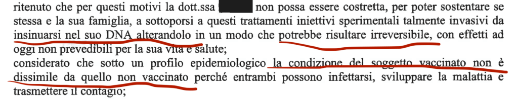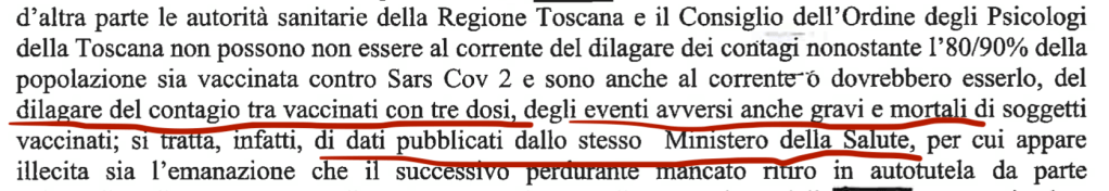 Nella sentenza è data evidenza al dilagare dei contagi anche tra i vaccinati ed agli eventi avversi gravi e mortali di soggetti vaccinati. Scrive ancora nella sentenza: “la condizione del soggetto vaccinato non è dissimile da quello non vaccinato perché entrambi possono infettarsi, sviluppare la malattia e trasmettere il contagio.”
