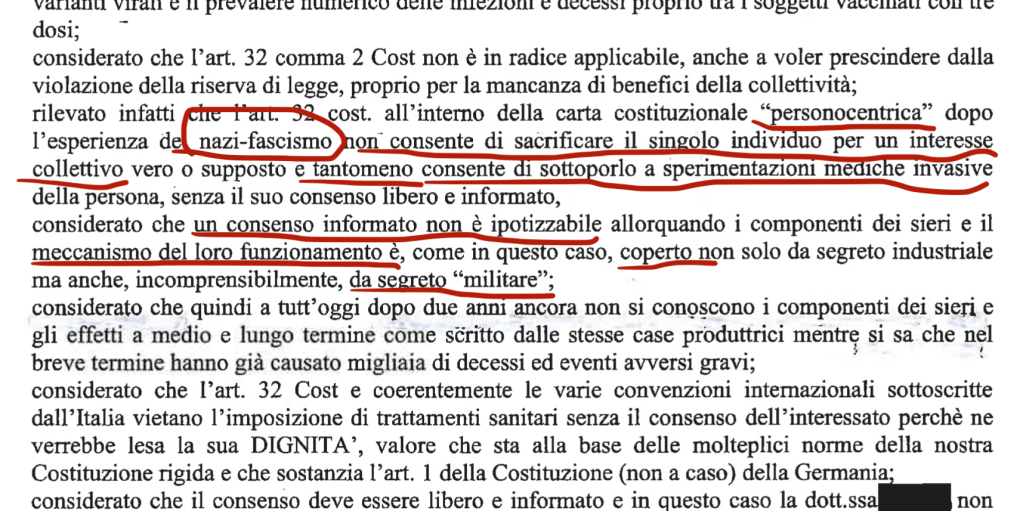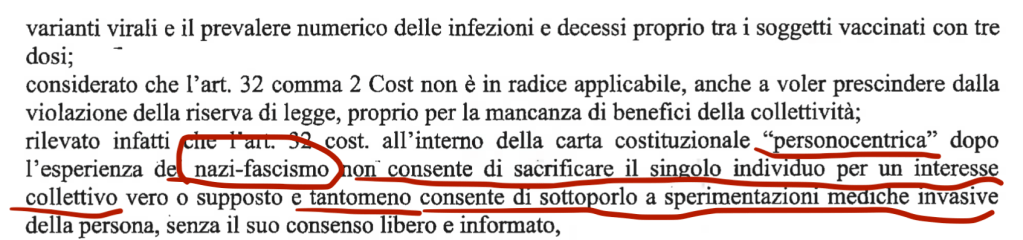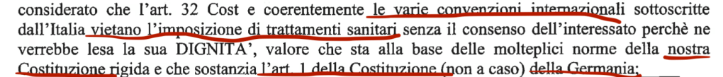 “l’art. 32 comma 2 all’interno della carta costituzionale “personocentrica” dopo l’esperienza del nazi-fascismo non consente di sacrificare il singolo individuo per un interesse collettivo vero o supposto e tantomeno consente di sottoporlo a sperimentazioni mediche invasive della persona senza il suo consenso libero ed informato.”