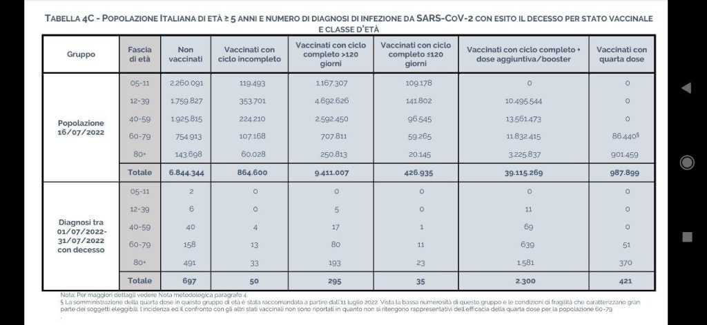 Dall’ultimo Bollettino ufficiale pubblicato in data 23/8/2022 dall’Istituto Superiore di Sanità italiano è emerso che nel mese di luglio 2022 ci sono stati 3.798 morti Covid di cui: