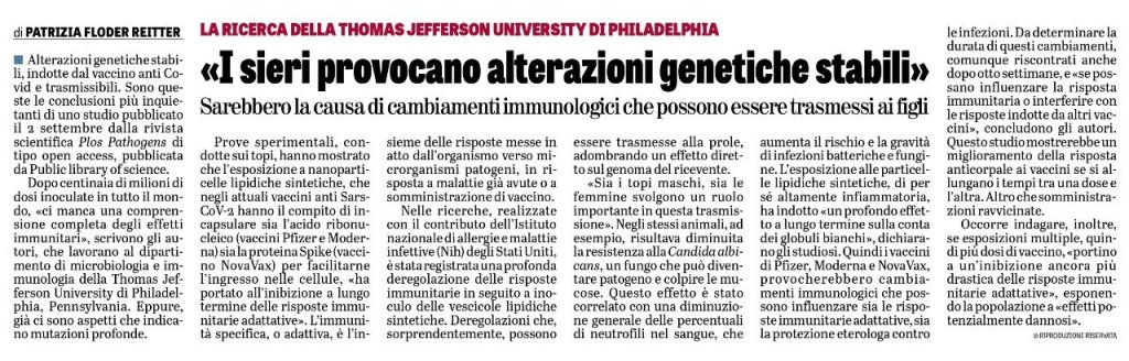 “Alterazioni genetiche stabili, indotte dal vaccino anti Covid e trasmissibili. Sono queste le conclusioni più inquietanti di uno studio pubblicato il 2 settembre dalla rivista scientifica Plos Pathogens di tipo open access, pubblicata da Public library of science. Dopo centinaia di milioni di dosi inoculate in tutto il mondo, «ci manca una comprensione completa degli effetti immunitari», scrivono gli autori, che lavorano al dipartimento di microbiologia e immunologia della Thomas Jefferson University di Philadelphia, Pennsylvania. Eppure, già ci sono aspetti che indicano mutazioni profonde.”