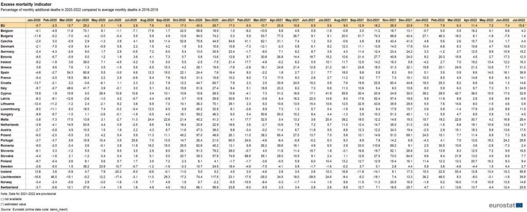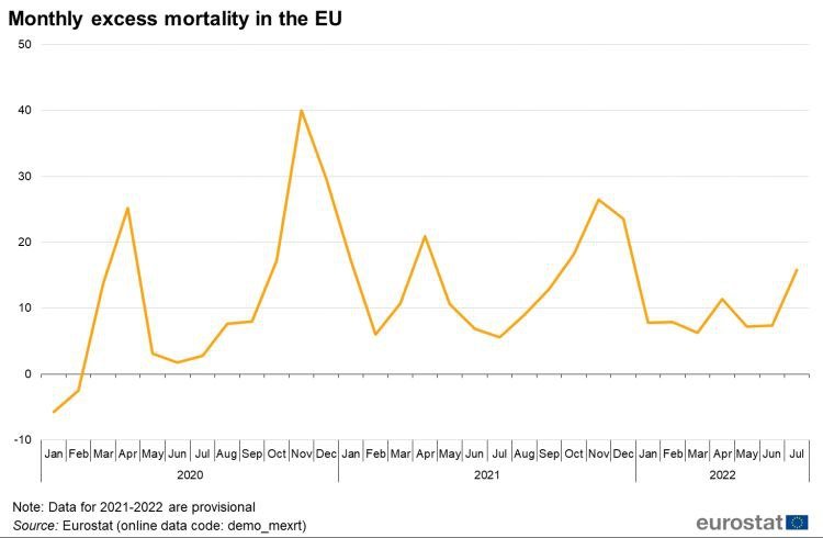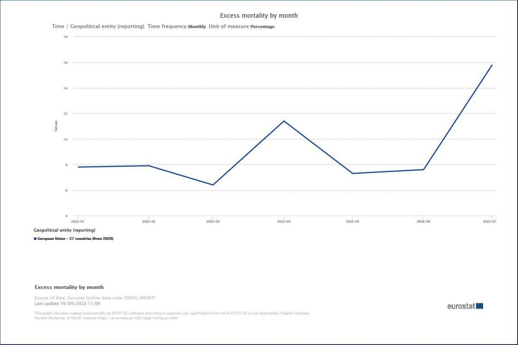 L’eccesso di mortalità nell’UE è salito a +16% a luglio 2022 dal +7% di giugno e maggio. Questo è stato il valore più alto mai registrato finora nel 2022, pari a circa 53.000 decessi aggiuntivi nel luglio di quest’anno rispetto alle medie mensili per il 2016-2019.
