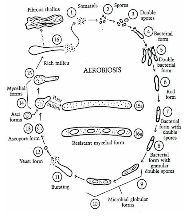 La medicina ha scoperto che siamo costituiti da quasi 2 chilogrammi di microrganismi di ogni specie, e questi sono suscettibili di metamorfosi da stadi inferiori e apatogeni di colloide o protide a stadi superiori patogeni come funghi e/o batteri.