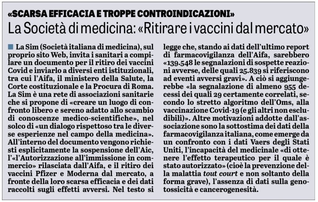 “Sim (Società italiana di medicina), sul proprio sito Web, invita i sanitari a compilare un documento per il ritiro dei vaccini Covid e inviarlo a diversi enti istituzionali, tra cui l’Aifa, il ministero della Salute, la Corte costituzionale e la Procura di Roma.