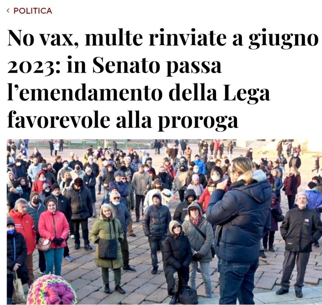 “Passano gli emendamenti della Lega che puntano a prorogare al 30 giugno 2023 il pagamento delle sanzioni per i “No Vax”: 1,9 milioni di persone che non si sono sottoposte all’obbligo vaccinale e che avrebbero dovuto pagare in questi giorni una multa da 100 euro a testa.”
