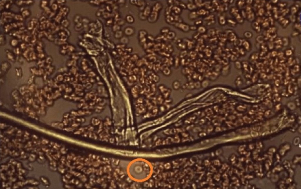 L’immagine successiva mostra una persona a cui è stato iniettato il farmaco sperimentale Covid. Il sangue è coagulato, i globuli rossi deformati sono raggruppati. La cellula cerchiata nell’immagine è un globulo rosso sano, uno dei pochi presenti nell’immagine, seduto accanto alle fibre di grafene. Si può notare la dimensione delle fibre di grafene rispetto a quella di un globulo rosso. Fibre di queste dimensioni bloccano i capillari. Si può anche notare che le fibre di grafene sono cave e contengono globuli rossi.