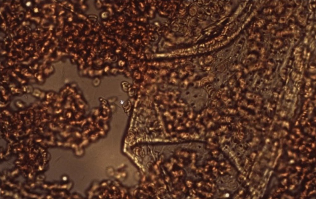 Immagine di destra: “Questi filamenti o tubi sembrano essere cavi – è davvero strano. Quando lo si espande, si possono vedere alcune cellule al suo interno, ma non sappiamo se si tratta di una struttura cristallina o organica. Le poche cellule sane sono cerchiate. Le altre sono incrinate e fratturate, sono finite. Questo non è sangue sano. Lo vediamo ancora e ancora”, Dr. van Welbergen.