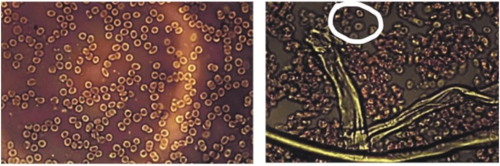 Immagine di sinistra: Il sangue sano mostra cellule in grado di muoversi separatamente; hanno una buona motilità e non causano trombosi.