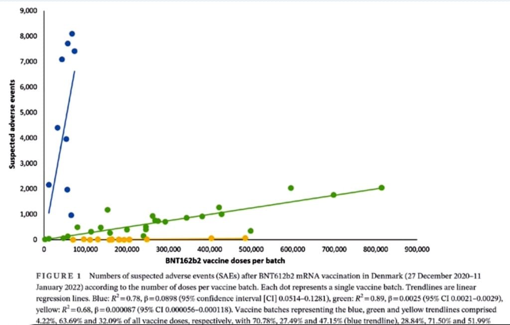 Un’altra serie di lotti, denominata “lotti blu”, era “associata a un livello straordinariamente elevato di eventi avversi” – con un tasso di eventi avversi gravi segnalati di 1 su 10 dosi, che rappresentano quasi il 50% dei decessi correlati al vaccino nel campione.