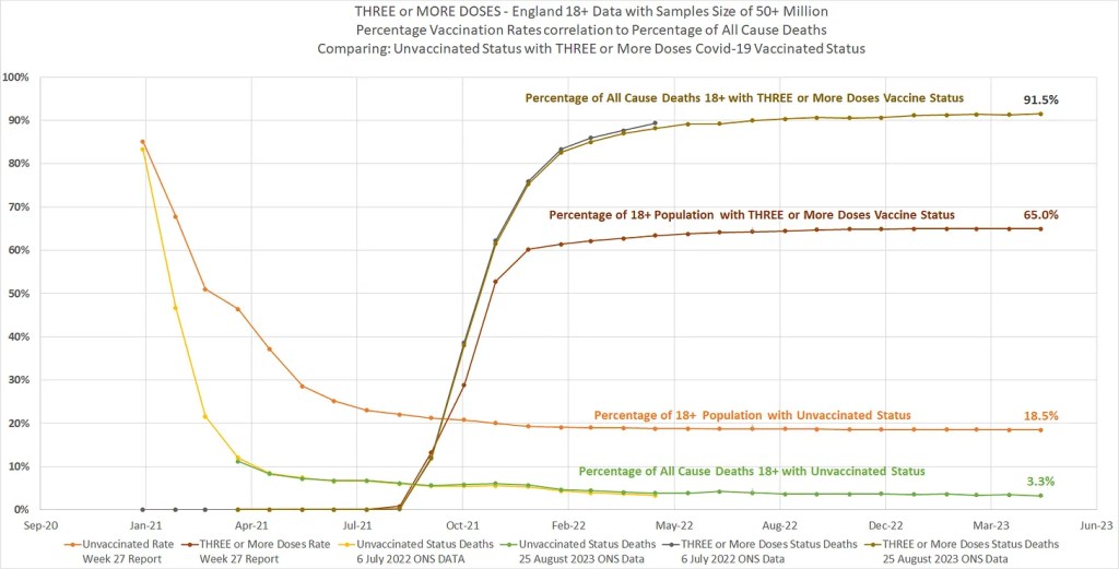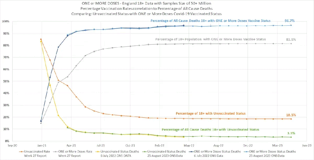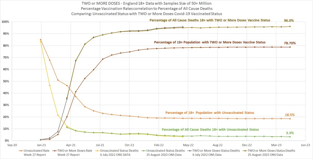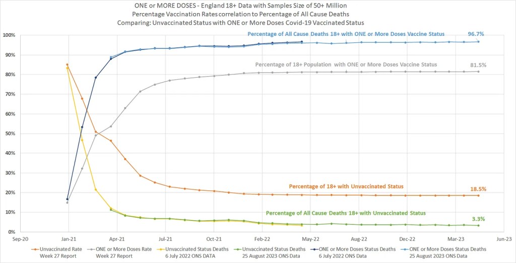 Il 95% dei decessi sarebbe tra le persone vaccinate (95) – Questo è SUPERIORE all’85% della popolazione rappresentata dai vaccinati