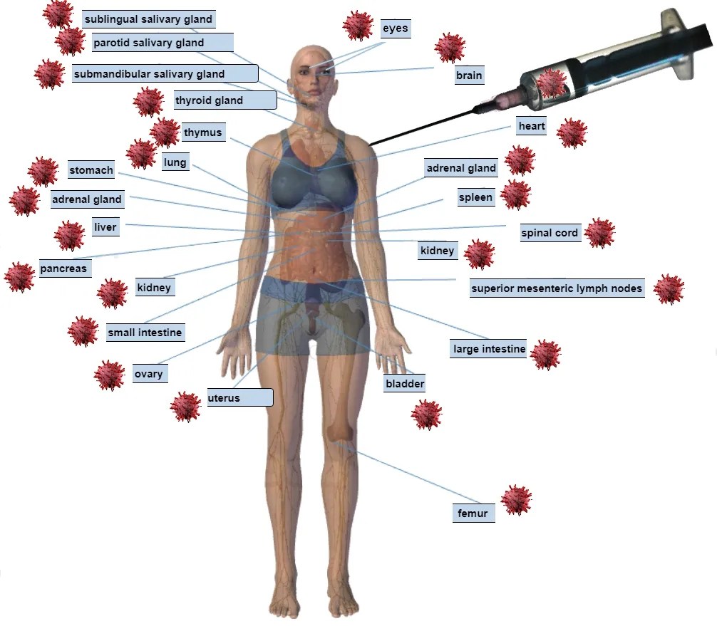 c) Con la biodistribuzione incontrollata dell’RNA messaggero sintetico c’è una combinazione infinita di carichi extra di produzione di proteine in tutto il corpo e i suoi vari tipi di cellule già dedicati al mantenimento di un delicato sistema e programma di produzione di proteine naturali come ormoni ed enzimi; fondamentale per il sano funzionamento del nostro organismo.
