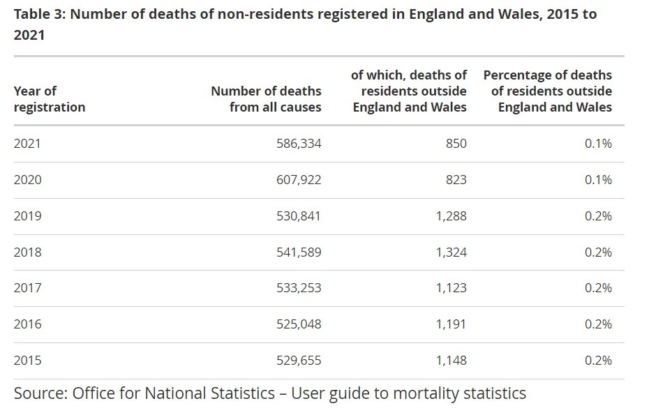 “Le statistiche sulla mortalità pubblicate si basano sui decessi registrati in Inghilterra e Galles, quindi includono alcuni decessi di residenti di altri paesi del Regno Unito e di visitatori, dove la morte è avvenuta in Inghilterra e Galles”.