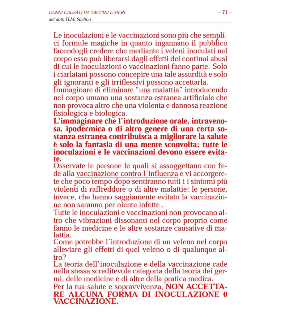 Osservate le persone le quali si assoggettano con fede alla vaccinazione contro l’influenza e vi accorgerete che poco tempo dopo sentiranno tutti i sintomi più violenti di raffreddore e di altre malattie; le persone, invece, che hanno saggiamente evitato la vaccinazione non saranno per niente infette.