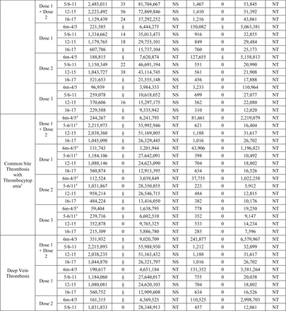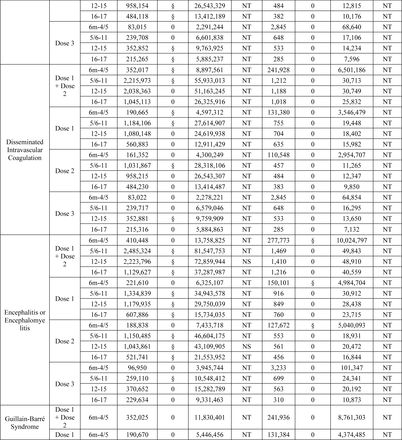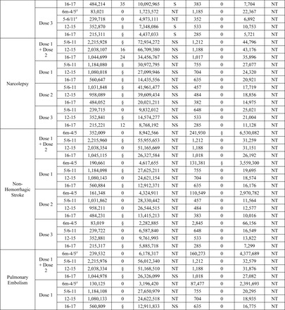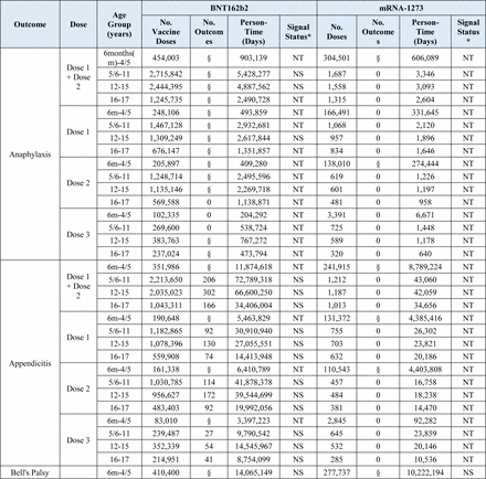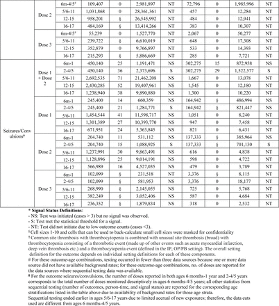 I test sono stati stratificati per età in base alle autorizzazioni specifiche per gruppo di età per marca di vaccino, nonché alla disponibilità di tassi di base utilizzando dati comparativi storici. Per BNT162b2, questa includeva età 6 mesi-4 anni, 6 mesi-1 anno e 2-4 anni (solo per crisi epilettiche/convulsioni), 5-11 anni, 12-15 anni e 16-17 anni. Per l’mRNA-1273, questo includeva 6 mesi-5 anni, 6 mesi-1 anno e 2-5 anni (solo per crisi epilettiche o convulsioni), 6-11 anni, 12-15 anni e 16-17 anni. Per NVX-CoV2373, le fasce di età erano 12-15 anni e 16-17 anni.