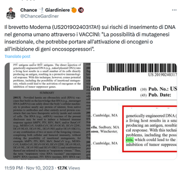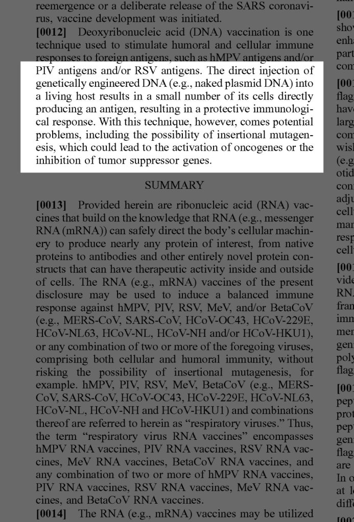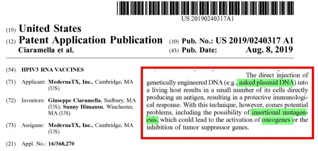 Il brevetto Moderna (US20190240317A1) sui rischi di inserimento di DNA nel genoma umano attraverso i VACClNl: “La possibilità di mutagenesi inserzionale, che potrebbe portare all’attivazione di oncogeni o all’inibizione di geni oncosoppressori”.
