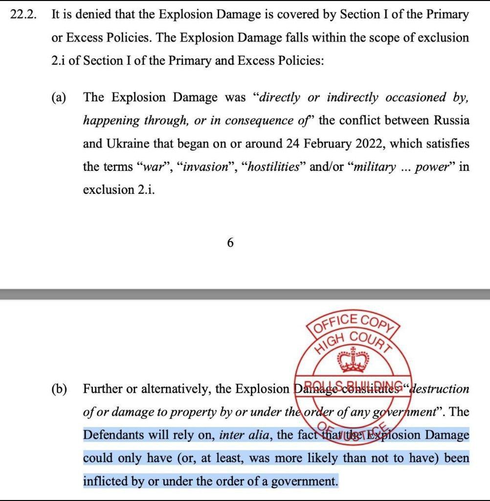 Il quotidiano Kommersant, citando i documenti del tribunale, ha affermato che l’assicurazione non copre i danni direttamente o indirettamente derivanti da guerra, azioni militari o detonazione di esplosivi.