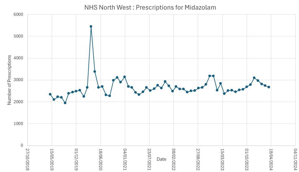 Le prescrizioni di midazolam sono aumentate durante la pandemia di COVID-19. I dati del Prescribing Dataset inglese mostrano un aumento delle prescrizioni di midazolam per scopi “sedativi o analgesici” nell’aprile 2020.