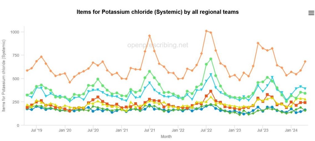 Nel contesto dell’eutanasia, il cloruro di potassio viene utilizzato per fermare il cuore. Gli spettacoli raggiungono il picco ogni luglio durante la “pandemia”. Questo è stato utilizzato in particolare nella regione del NHS delle Midlands.