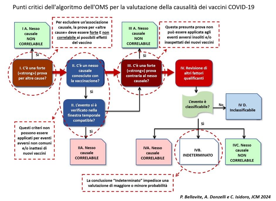 Per valutare la correlazione e l’eventuale nesso di causalità tra vaccinazione e gli eventi avversi gravi (inclusi i decessi) che sono segnalati, l’OMS ha proposto e diffuso un protocollo che utilizza un elenco di domande sul caso in esame, le cui risposte servono poi a formulare un giudizio finale seguendo un algoritmo. L’AIFA (Agenzia Italiana del Farmaco, al tempo diretta da Nicola Magrini, sostituito da Anna Rosa Marra al 15 gennaio 2023) ha adottato questo protocollo per la valutazione degli eventi avversi in tutti i rapporti emanati nei primi due anni della somministrazione di questi pro-vaccini genici anti-COVID-19. In questo studio, i ricercatori hanno analizzato in dettaglio il protocollo OMS mettendo in luce i difetti della sua applicazione, in particolare quando si ha a che fare con eventi patologici nuovi e inaspettati potenzialmente causati da un pro-vaccino di nuova generazione e di cui si conosce ancora troppo poco. I principali aspetti controversi del metodo OMS (vedi riassunto grafico) riguardano: