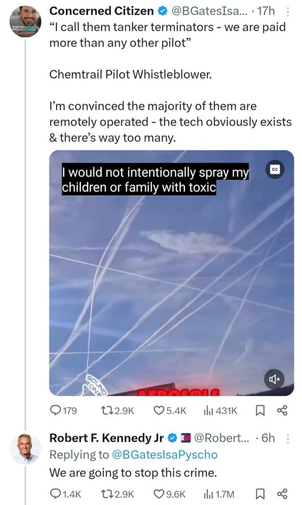 Abbiamo smascherato i caporioni, coloro che finanziano e orchestrano l’operazione dall’alto. Ma non finisce qui. Anche gli individui che commettono questi crimini possono essere ritenuti responsabili.Prendete questa donna coraggiosa, per esempio. Ha colto due piloti di scie chimiche in flagrante, mentre spruzzavano tossine da 15.000 piedi, avvelenando l’aria che respira la sua famiglia. Non è rimasta in silenzio. Ha agito.E la sua storia è solo l’inizio.Il taglio dell’afflusso di denaro tramite USAID sembra aver temporaneamente bloccato le operazioni relative alle scie chimiche, almeno questo è quanto riferiscono testimoni oculari in tutta America.Ma anche se questo è un passo nella giusta direzione, non è la fine. Non possiamo permetterci di sentirci comodi. Dobbiamo restare vigili, perché quando operazioni così grandi vengono interrotte, chi tira i fili non si tira indietro, si adatta.Non è solo negli Stati Uniti. Sembra che i soldi dell’USAID stessero finanziando i piloti per spruzzare scie chimiche sulle popolazioni in Europa, che hanno anche segnalato cieli più sereni dopo i tagli ai finanziamenti.C’è ancora più speranza all’orizzonte. Robert F. Kennedy Jr., una volta confermato a capo del Department of Health and Human Services, ha giurato di porre fine a quello che lui chiama il “crimine delle scie chimiche” e, diciamocelo, non possiamo ottenere la conferma abbastanza presto.