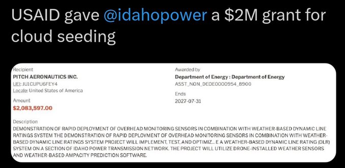 Hanno stanziato due milioni di dollari, i vostri soldi delle tasse guadagnati duramente, solo per spruzzare i cittadini dell’Idaho con tossine di metalli pesanti. Questa non è una folle teoria del complotto. È un fatto cospirazionista, sostenuto da contratti firmati, sigillati e bloccati fino al 2027. E questo è solo uno stato.Se solo l’Idaho costa due milioni, quanto spendono per avvelenare il resto del Paese? Quanti altri stati? Quante altre vite sono a rischio?Ma ecco la parte più inquietante: il Congresso non solo lo sapeva. Lo ha approvato. Un piano quinquennale, interamente finanziato, approvato senza fare domande, che assicura che l’irrorazione continuerà, ininterrotta, fino al 2027. Pensateci.