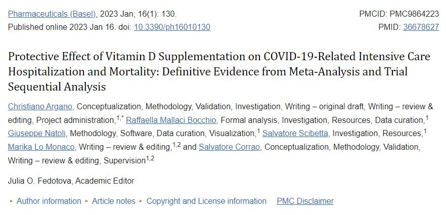 Nel gennaio 2023, uno studio di Christiano Argano e colleghi ha scoperto che l’assunzione di sola vitamina D riduceva il rischio di morte e di ricovero in terapia intensiva per infezione da COVID-19. Nello specifico, le probabilità di morte sono diminuite di circa il 51% e il rischio di ricovero in terapia intensiva è diminuito di circa il 72%.