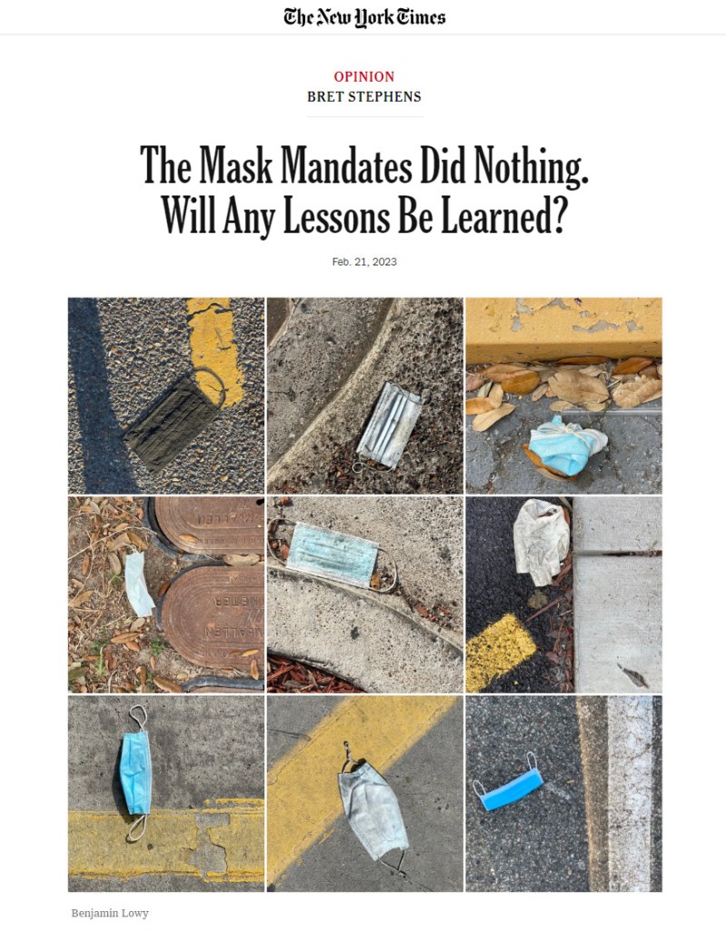 Nel febbraio 2023, il New York Times ha scioccato il mondo con questo titolo: ” Gli obblighi di mascherina non hanno fatto nulla. Impareremo qualche lezione? “