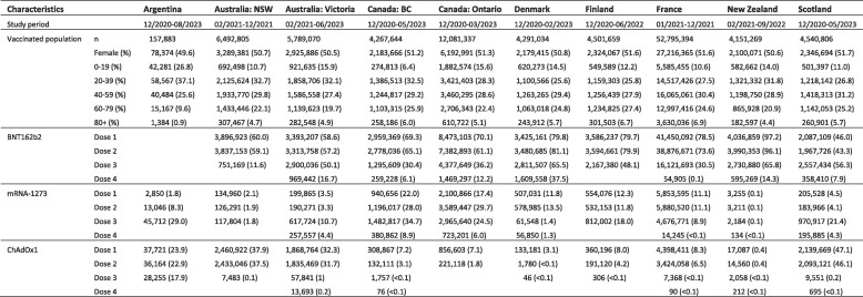 Tabella 1 ). In totale, 183.559.462 dosi di BNT162b2, 36.178.442 dosi di mRNA-1273 e 23.093.399 dosi di ChAdOx1 sono state somministrate in tutti i siti nei periodi di studio. Il numero più elevato di dosi è stato somministrato in Francia (120.758.419), seguito da Canada – Ontario (32.159.817) e Australia – Victoria (15.617.627). In totale, 23.168.335 anni-persona hanno contribuito ai rapporti OE per l’AESI seguendo programmi omologhi. Il riepilogo della popolazione è presentato nella