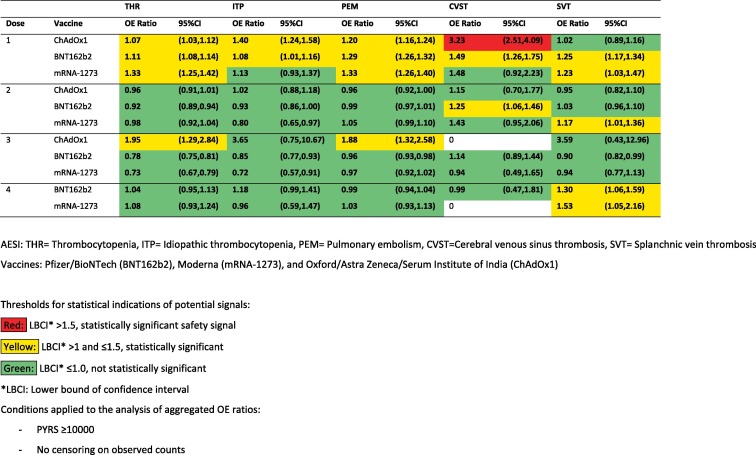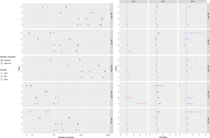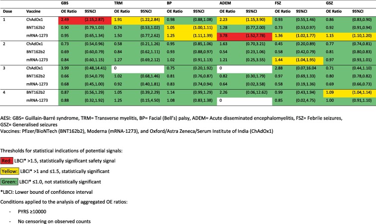 [13] . Il periodo di follow-up osservato in anni-persona per un dato profilo vaccinale e periodo post-vaccinazione è stato stratificato in base a fascia di età e sesso. Ciascuno degli anni-persona stratificati per età e sesso è stato moltiplicato per il corrispondente tasso di background stratificato per età e sesso. Ciò ha determinato il numero previsto di casi in ogni strato, che sono stati poi sommati per fornire il numero totale di casi previsti durante il periodo di follow-up osservato.I rapporti OE aggregati per ultima dose sono stati calcolati dividendo il numero di casi osservati per il numero di casi previsto nel periodo post-vaccinazione, gli intervalli di confidenza (CI) del 95% sono stati derivati utilizzando la distribuzione di Poisson esatta. Abbiamo anche calcolato i rapporti OE per i programmi omologhi per i vaccini BNT162b2, mRNA-1273 e ChAdOx1 fino a quattro dosi. Sono presentati sia i rapporti OE aggregati che quelli specifici per i programmi omologhi.Abbiamo considerato un rapporto OE un potenziale segnale di sicurezza preoccupante in cui il limite inferiore del 95% CI (LBCI) era maggiore di uno e raggiungeva la significatività statistica