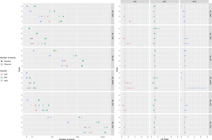 Fig. 3. Numero di eventi e rapporti OE (con intervallo di confidenza del 95%) per programmi omologhi per dose 1–4, condizioni cardiovascolari . AESI: MYO = Miocardite , PER = Pericardite . Vaccini: Vaccini: AZD = Oxford/Astra Zeneca/Serum Institute of India (ChAdOx1), BNT = Pfizer/BioNTech (BNT162b2), MOD = Moderna (mRNA-1273).