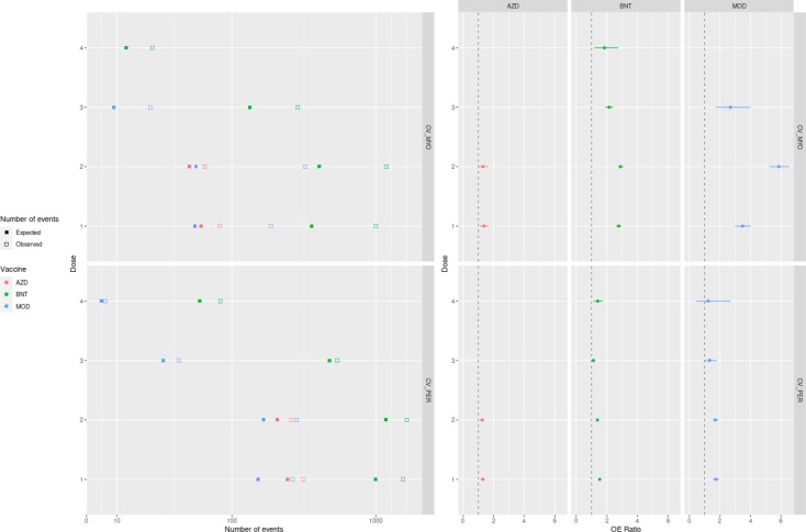 Fig. 1 ). Anche il rapporto OE per ADEM entro 42 giorni dalla prima dose di mRNA-1273 ha soddisfatto la soglia di significatività di un segnale di sicurezza prioritario (3,78; IC al 95%: 1,52, 7,78), con due eventi previsti rispetto a sette eventi osservati (