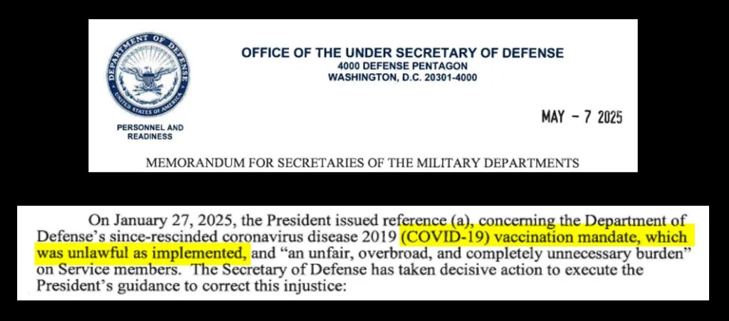 Il memorandum del Dipartimento della Difesa statunitense del 7 maggio 2025 riconosce l’illecito commesso nei confronti dei militari congedati per essersi rifiutati di ricevere il vaccino contro il COVID-19 o per aver lasciato volontariamente l’esercito a causa dell’obbligo di vaccinazione contro il COVID-19.