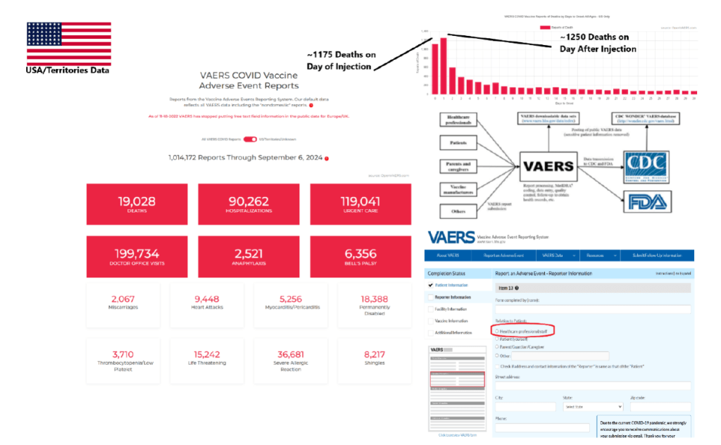 Il CDC ha stimato che il 70,3% degli americani di età ≥16 anni avesse contratto il COVID-19 entro settembre 2022, utilizzando la misurazione degli anticorpi anti-SARS-CoV-2 [4]. Al 1° dicembre 2024, stimiamo che almeno il 90% dell’intera popolazione statunitense abbia contratto la malattia da COVID-19 e abbia un’immunità naturale al SARS-CoV-2. Il CDC ha riportato 1.212.008 decessi avvenuti tra il 1° gennaio 2020 e il 23 novembre 2024, con un test positivo per COVID-19 in un momento prima del decesso [5]. Tra questi, il 94% aveva più di 50 anni. Se l’aggiudicazione fosse eseguita da medici esperti, stimiamo che circa il 10% del conteggio totale delle vittime o 121.200 decessi potrebbero avere la polmonite da COVID-19 come causa primaria di morte. Procter et al. hanno pubblicato che l’85% di questi decessi avrebbe potuto essere evitato con protocolli multifarmaco precoci iniziati il giorno 1 a casa [6]. La Figura 1 mostra che, entro il 6 settembre 2024, il CDC ha registrato 19.028 decessi americani dovuti al vaccino COVID-19 segnalati nel Vaccine Adverse Event Reporting System (VAERS) da operatori sanitari o aziende farmaceutiche che ritengono che il prodotto sia correlato al decesso [7]. Circa 1175 decessi si sono verificati lo stesso giorno della vaccinazione e 1250 decessi il giorno successivo alla vaccinazione. Si stima che i decessi segnalati nel VAERS siano sottostimati di un moltiplicatore conservativo di 31, sulla base di un confronto tra i tassi attesi di eventi avversi gravi (SAE) dagli studi clinici e i rapporti osservati nel VAERS [8]. I dati degli studi clinici di Pfizer indicavano un tasso di eventi avversi gravi (SAE) dello 0,7%, che, applicato alle 197 milioni di dosi di vaccini contro il COVID-19 somministrate negli Stati Uniti entro agosto 2021, suggerirebbe circa 1,4 milioni di eventi avversi gravi attesi. Tuttavia, il sistema VAERS ha documentato un numero di casi molto inferiore, portando alla conclusione che solo 1 decesso o evento avverso grave su 31 viene registrato nel sistema VAERS a causa della sua natura di segnalazione passiva e delle note difficoltà di sottosegnalazione [8]. Ciò significa che il bilancio delle vittime americane dovute alla vaccinazione contro il COVID-19 potrebbe essere di 589.868 (19.028 x 31). Pertanto, riteniamo che più americani potrebbero essere morti a causa della vaccinazione contro il COVID-19 che a causa dell’infezione da SARS-CoV-2. Esistono oltre 3400 manoscritti sottoposti a revisione paritaria nella letteratura medica riguardanti i danni fatali e non fatali da vaccino contro il COVID-19, inclusi quelli riconosciuti dalle agenzie regolatorie di tutto il mondo come miocardite, danno neurologico, trombosi e sindromi immunologiche. Evidenze emergenti provenienti da diversi set di dati globali indicano modelli di eventi avversi preoccupanti e tendenze di mortalità associati alle campagne di vaccinazione contro il COVID-19, sollevando interrogativi critici sul rapporto rischio-beneficio e sulla sicurezza a lungo termine. A causa di queste significative preoccupazioni, abbiamo esaminato la letteratura per eccesso di mortalità, contaminazione del DNA, e l’efficacia negativa associata al COVID-19 vaccini, oltre a compilare un elenco completo di tutte le richieste di una moratoria immediata.