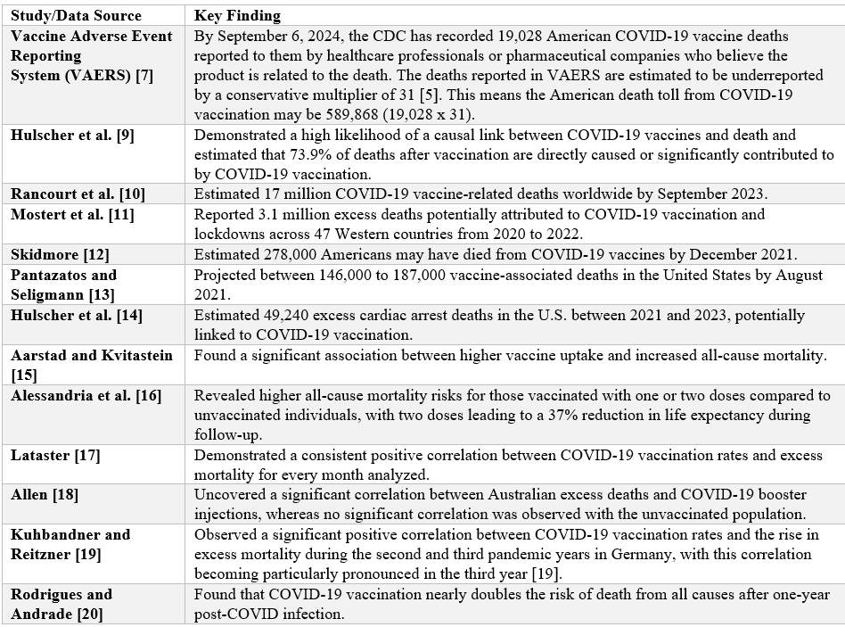 Invece di salvare vite umane, la vaccinazione di massa contro il COVID-19 ha probabilmente portato a un aumento della mortalità (Tabella 1) [9-20]. Il più grande studio autoptico pubblicato fino ad oggi indica che il 73,9% dei decessi dopo la vaccinazione è una causa diretta o significativamente contribuito dalla vaccinazione contro il COVID-19, dimostrando un’alta probabilità di un nesso causale tra i vaccini contro il COVID-19 e la morte [9]. Entro settembre 2023, Rancourt et al. hanno stimato 17 milioni di decessi correlati al vaccino contro il COVID-19 in tutto il mondo [10]. Mostert et al. hanno riportato 3,1 milioni di decessi in eccesso potenzialmente attribuiti alla vaccinazione contro il COVID-19 e ai lockdown in 47 paesi occidentali dal 2020 al 2022 [11]. La significativa discrepanza nei dati sulla mortalità in eccesso tra Rancourt e Mostert deriva probabilmente dalla portata e dall’intervallo temporale delle loro stime: l’analisi di Rancourt tiene conto di 195 paesi fino alla fine del 2023, mentre quella di Mostert si concentra su 47 paesi occidentali fino al 2022. Negli Stati Uniti, Skidmore ha stimato che 278.000 americani potrebbero essere morti a causa dei vaccini COVID-19 entro dicembre 2021 [12], mentre Pantazatos e Seligmann hanno previsto tra 146.000 e 187.000 decessi associati al vaccino entro agosto 2021 [13]. Hulscher et al. hanno stimato 49.240 decessi in eccesso per arresto cardiaco negli Stati Uniti tra il 2021 e il 2023, potenzialmente collegati alla vaccinazione COVID-19 [14]. Aarstad e Kvitastein hanno trovato una significativa associazione tra un aumento assunzione del vaccino e aumento della mortalità per tutte le cause [15]. Alessandria et al. hanno rivelato che gli individui vaccinati con una o due dosi hanno affrontato rischi di mortalità per tutte le cause più elevati rispetto agli individui non vaccinati, con coloro che hanno ricevuto due dosi che hanno perso il 37% dell’aspettativa di vita durante il follow-up [16]. Lataster ha inoltre dimostrato una correlazione positiva coerente tra i tassi di vaccinazione COVID-19 e l’eccesso di mortalità per ogni mese analizzato [17]. Allen ha scoperto una correlazione significativa tra l’eccesso di decessi australiani e il richiamo COVID-19 iniezioni, mentre non è stata osservata alcuna correlazione significativa con la popolazione non vaccinata [18]. Kuhbandner e Reitzner hanno osservato una significativa correlazione positiva tra i tassi di vaccinazione COVID-19 e l’aumento della mortalità in eccesso durante il secondo e il terzo anno di pandemia in Germania, con questa correlazione che è diventata particolarmente pronunciata nel terzo anno [19]. Rodrigues e Andrade hanno scoperto che la vaccinazione COVID-19 quasi raddoppia il rischio di morte per tutte le cause dopo un anno dall’infezione da COVID [20].