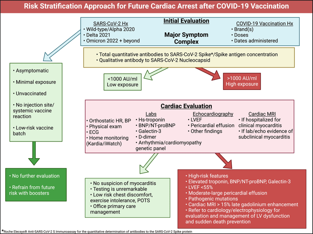 L’arresto cardiaco non annunciato tra giovani precedentemente sani senza malattia antecedente, mesi o anni dopo la vaccinazione contro la malattia da coronavirus 2019 (COVID-19), evidenzia l’urgente necessità di stratificare il rischio. La fisiopatologia sottostante più probabile è la miopericardite subclinica e latachicardia ventricolare da rientro o la fibrillazione ventricolare spontanea che è comunementeprecipitata dopo un picco di catecolamine durante l’esercizio fisico o le ore di veglia del sonno terminale. Piccole chiazze di infiammazione e/o edema possono essere perse all’imaging cardiaco e all’autopsia e il cuore può apparire grossolanamente normale. Questo articolo esamina le prove che collegano i vaccini COVID-19 all’arresto cardiaco, dove purtroppo la maggior parte delle vittime non ha avuto una valutazione clinica antecedente. Proponiamo una strategia completa per la valutazione del rischio cardiovascolare post-vaccinazione, che incorpora l’anamnesi dettagliata del paziente, i test anticorpali e la diagnostica cardiaca nel miglior tentativo di rilevare anomalie prima della morte cardiaca improvvisa. Questo approccio mira a identificare gli individui a più alto rischio di eventi cardiaci dopo la vaccinazione COVID-19 e a guidare un’appropriata gestione clinica. È prudente che ogni medico di base abbia un piano prestabilito quando affronta questo problema nella propria pratica.
