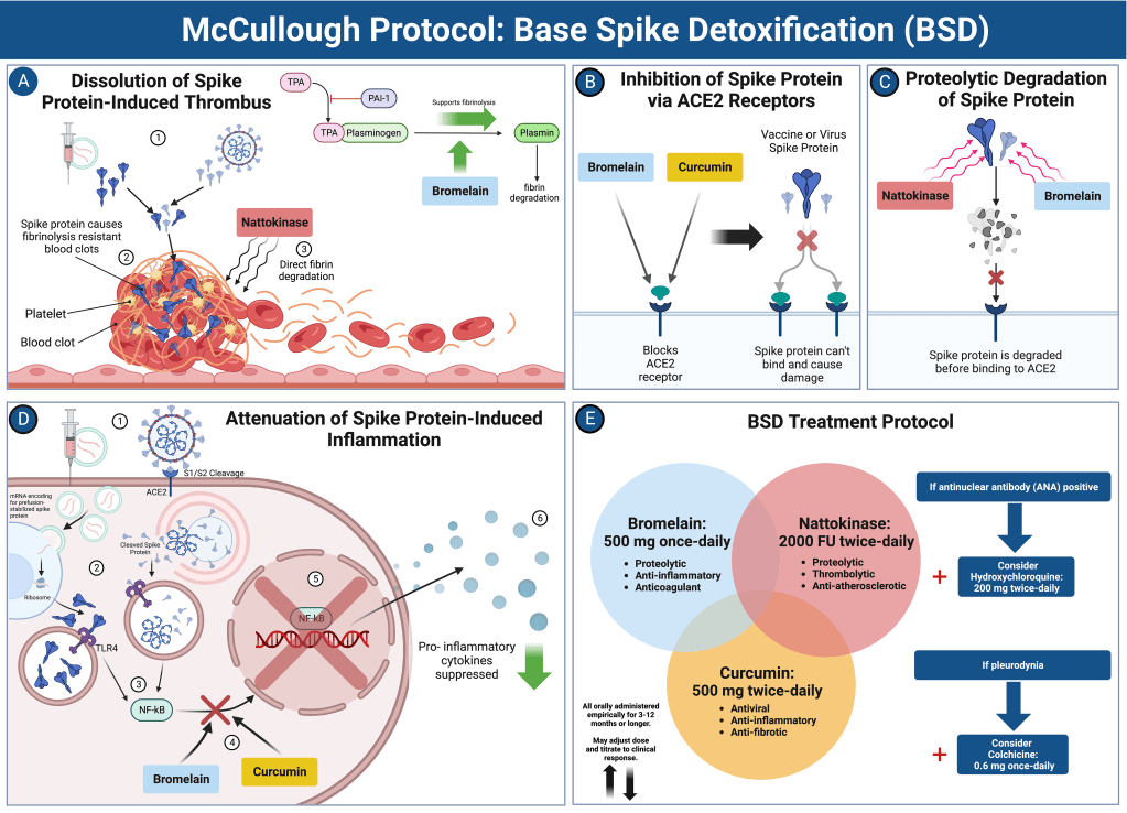 Un’anamnesi dettagliata dell’infezione da SARS-CoV-2 e della somministrazione del vaccino è essenziale per la valutazione. Va notato il COVID-19 grave che richiede il ricovero in ospedale e la ventilazione meccanica. Ogni infezione da SARS-CoV-2 e dose di vaccino COVID-19 può essere considerata una “esposizione”. Si può ragionevolmente presumere che maggiore è il numero di esposizioni, più è probabile che ci siano grandi quantità di proteina Spike nel corpo, dove le proteasi naturali e i lisosomi sembrano incapaci di eliminarla [25]. Un anticorpo totale a intervallo esteso contro la proteina Spike è un utile proxy per una precedente esposizione a Spike. Ad esempio, il test Anti-SARS-CoV-2 Spike di Roche Diagnostics Elecsys misura gli anticorpi contro il dominio di legame del recettore[26]. Il test Roche Elecsys Anti-SARS-CoV-2 ha un valore normale di < 0,8 U/mL e, nella pratica clinica, 0-1000 è a basso rischio e > 1000 indica un rischio più elevato con infezioni multiple o somministrazioni di vaccini COVID-19. Abbiamo osservato che non è raro trovare pazienti con > 25000 U/mL, che rimangono incommensurabilmente alti anche anni dopo la vaccinazione. Le concentrazioni di anticorpi possono richiedere almeno 12 mesi per diminuire. Pertanto, un test dell’antigene Spike misurabile nel sangue intero, nel plasma o nel siero è estremamente necessario per fornire una stima in tempo reale della tossicità dello Spike. Se (1) il numero di esposizioni alla proteina Spike era basso; (2) ci sono state infezioni non gravi; (3) I livelli di anticorpi spike sono inferiori a 1000 U/mL; (4) sito di iniezione minimo o assente o reazione sistemica iniziale alla vaccinazione[27,28]; e (5) se il vaccino è stato ottenuto da un lotto a basso rischio[29,30] (con zero ricoveri e decessi riscontrati in un’analisi del lotto VAERS[31]), allora potrebbero non essere necessarie ulteriori indagini cliniche. Se ci sono caratteristiche di rischio più elevate, come indicato nella Figura 2, è prudente eseguire test cardiaci più formali e stratificare il rischio. È ragionevole ottenere un elettrocardiogramma e un esame del sangue per troponina ad alta sensibilità, BNP/NT-ProBNP, galectina-3 e D-dimero. La troponina elevata può indicare una miocardite in corso[32]. BNP/NT-proBNP sono indicatori affidabili di pressione cardiaca/sovraccarico di volume e predicono l’insufficienza cardiaca [33]. La galectina-3 è un marcatore di infiammazione/fibrosi cronica e, quando elevata, predice l’insufficienza cardiaca futura[34]. Il D-dimero è un proxy per la microcoagulazione del sangue[35] e, nella nostra esperienza, < 0,2 è a basso rischio, 0,2-0,5 è moderato e > 0,5 è ad alto rischio di eventi trombotici. Patel et al[36] hanno dimostratoche il 17% dei partecipanti ha mostrato un aumento dei livelli di d-dimero rispetto al normale basale dopo la vaccinazione COVID-19. I test genetici per le mutazioni patogene nei canali ionici cardiaci o nelle proteine principali sono ragionevoli nei pazienti con reperti ad alto rischio o arresto cardiaco rianimato. Le mutazioni nel canale del sodio SCN5A sono state associate a un aumento del rischio di arresto cardiaco da vaccino COVID-19[37]. L’ecocardiografia point-of-care o l’ecografia cardiaca formale e il Doppler possono essere utilizzati per valutare la struttura cardiaca, la funzione e la presenza di liquido pericardico[38]. Questo pacchetto di diagnostica, quando i risultati sono completamente normali, suggerisce un basso rischio di futura insufficienza cardiaca e morte cardiaca[39]. Al contrario, molteplici anomalie riscontrate nell’elettrocardiogramma, negli esami del sangue e nell’ecocardiografia possono richiedere l’uso della risonanza magnetica cardiaca (MRI) con contrasto[40]. La risonanza magnetica è confermativa per la funzione ventricolare sinistra e, soprattutto, può rilevare aree di infiammazione/cicatrice con aumento tardivo del gadolinio (LGE)[41]. In altri tipi di cardiomiopatia, l’LGE ≥ il 15% del ventricolo sinistro indica un alto rischio di arresto cardiaco[42]. Piccole chiazze di infiammazione miocardica, edema o fibrosi potrebbero non essere rilevabili da fette assiali alla risonanza magnetica cardiaca o all’autopsia[43,44]. Pertanto, il cuore può apparire normale all’esame post-mortem e il rapporto finale può indicare la morte per “cause naturali” in un paziente sano senza malattia antecedente. Riteniamo che questi casi rappresentino probabilmente miocardite subclinica precedentemente silente e fibrosi cardiaca che funge da substrato per la tachicardia ventricolare rientrante che degenera in fibrillazione ventricolare e asistolia nei pazienti che non ricevono una defibrillazione immediata. Quando la stratificazione del rischio indica un basso rischio, la gestione dell’ufficio di assistenza primaria è suggerita con il Protocollo McCullough: Disintossicazione Base Spike e farmaci aggiuntivi a seconda della sindrome (Figura 3)[25]. Per la miopericardite subclinica, la colchicina orale 0,6 mg due volte al giorno (BID) o una volta al giorno è indicata per almeno un anno[45]. Per la sindrome da tachicardia posturale ortostatica indotta da vaccino COVID-19, può essere utile l’uso di colchicina e nadololo 20-40 mg BID[46]. Nei pazienti che risultano ad alto rischio, è indicata anche la disintossicazione da Base Spike[25]. Per coloro che sono ad alto rischio di cardiomiopatia e/o aritmie ventricolari, viene suggerita una consultazione cardiologica formale con l’obiettivo principale di prevenire l’insufficienza cardiaca e la morte improvvisa. Inoltre, alcuni pazienti possono richiedere l’impianto di ICD in presenza di aritmie sintomatiche, LGE > 15% o predittori genetici come mutazioni patogene SCN5A [37,47].