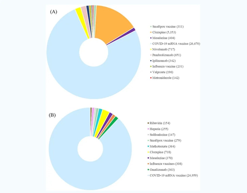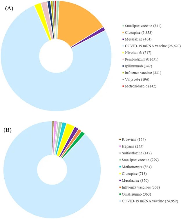 - Miocardite: 35.017 segnalazioni totali; il 76,16% (26.670 casi) è legato ai vaccini mRNA contro il COVID-19, seguiti dalla clozapina (15,29%).