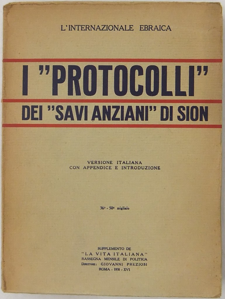 - Preziosi, Giovanni: Direttore de “La Vita Italiana”, editore della presente edizione dei “Protocolli”, strenuo sostenitore dell’antisemitismo e della denuncia della cospirazione ebraica.